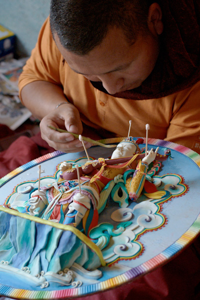 A Bodhgaya, les créateurs de tormas travaillaient dans deux grandes pièces du monastère bhoutanais. L’une était destinée aux décorations, et l’autre aux représentations les plus complexes. Les artistes étaient assis le long des murs, leur œuvre sur une table en face d’eux. La concentration méditative était palpable pendant qu’ils donnaient forme à la mixture ( huile de palme, cire et céréales) en partant de la base ronde. Plus tard, lorsque les derniers détails auraient été vérifiés, toutes les différentes parties – la représentation centrale et les figures annexes, les offrandes, les feuilles, les fruits, les fleurs – seraient attachées à un morceau de bois sculpté de 1m83, et l’ensemble prendrait vie. Dans la soirée du 28 février, lorsque les routes de Bodhgaya furent presque vides, les tormas ont été transportées avec précaution au monastère de Tergar, sur des charrettes à bras et placée en une ligne impressionnante sur l’autel du chapiteau du Monlam.