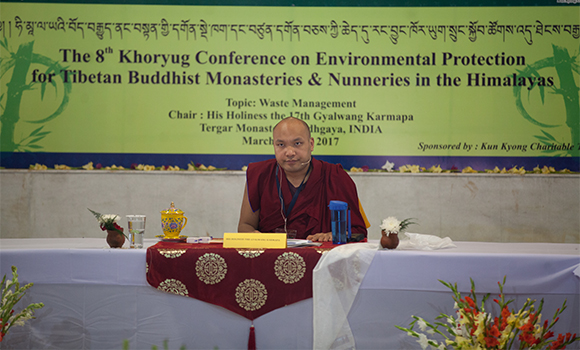 La 8e conférence annuelle de Khoryug réunit au monastère de Tergar 72 délégués, qui représentent 27 monastères de moines et de nonnes, des écoles et des communautés, venus de toute la région himalayenne. Khoryug a été fondé en 2009 par le 17e Karmapa, Orgyèn Trinlé Dorjé; c’est une association environnementale qui rassemble des monastères bouddhistes tibétains travaillant tous pour la protection de l’environnement, le développement durable et la résilience face au changement climatique. Khoryug est une initiative du Kun Kyong Charitable Trust ; la conseillère de Khoryug, Dekila Chungyalpa, et le responsable de programme de Khoryug, Lhakpa Tséring, présentent la journée et saluent chaleureusement tous les participants.